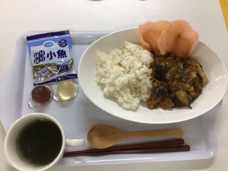 今月のメニューは「鶏肉とナスのみそ炒め」でした。
