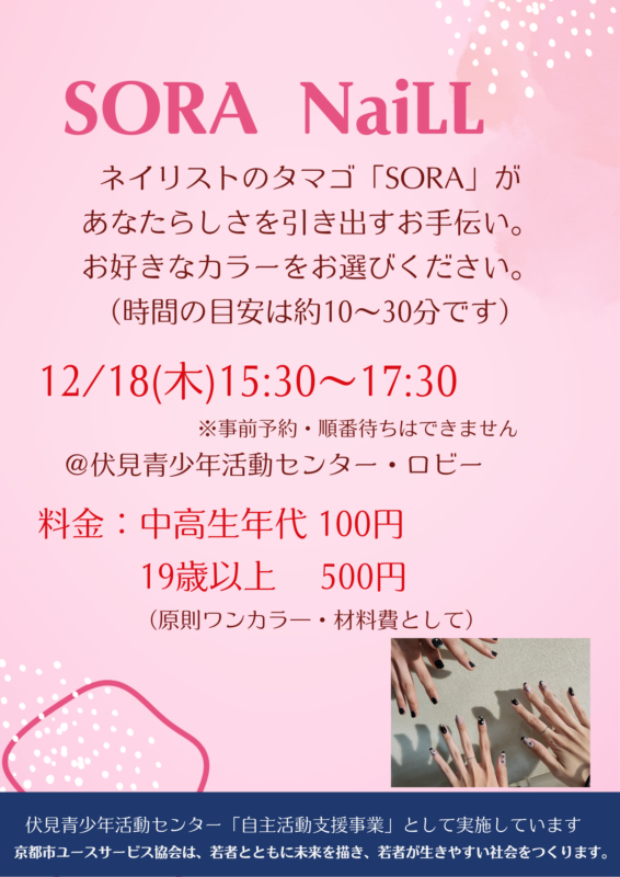 ネイリストのタマゴ「SORA」が、不定期で開催しているネイルサロン「SORA NaiLL(そらネイル)」。