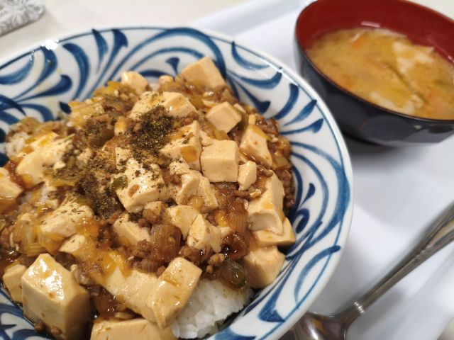 麻婆丼には豆腐とひき肉がたっぷり。たんぱく質を取ることができますし、 豚汁では、お野菜もしっかり食べられます。 リンゴには、ビタミン、ミネラル、食物繊維もたっぷり。 この一食で、栄養たっぷり、バランスの取れた食事になりました。