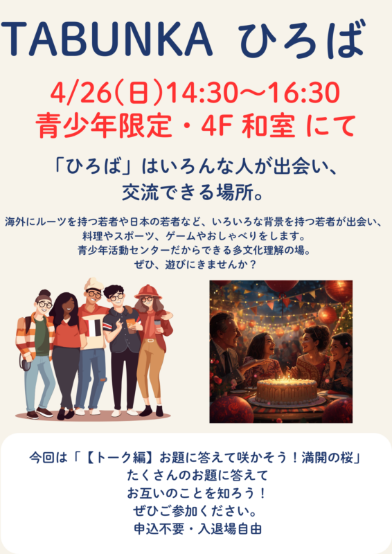 海外にルーツがある若者、日本の若者など、いろいろな背景の若者が集まって、 料理、スポーツ、ゲーム、おしゃべりなどをします。