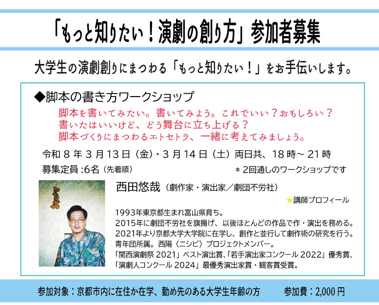 『もっと知りたい!演劇の創り方』参加者募集中! 中学・高校生のための演劇ワークショップ2025 演劇創りにまつわる「もっと知りたい!」をお手伝いします。 どちら...