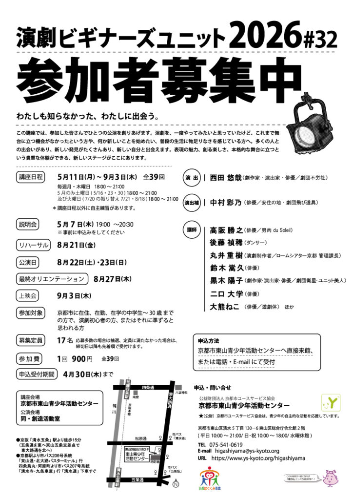 対象:京都市内に在住・在学・在勤の中学生年齢から30歳までの方で演劇初心者