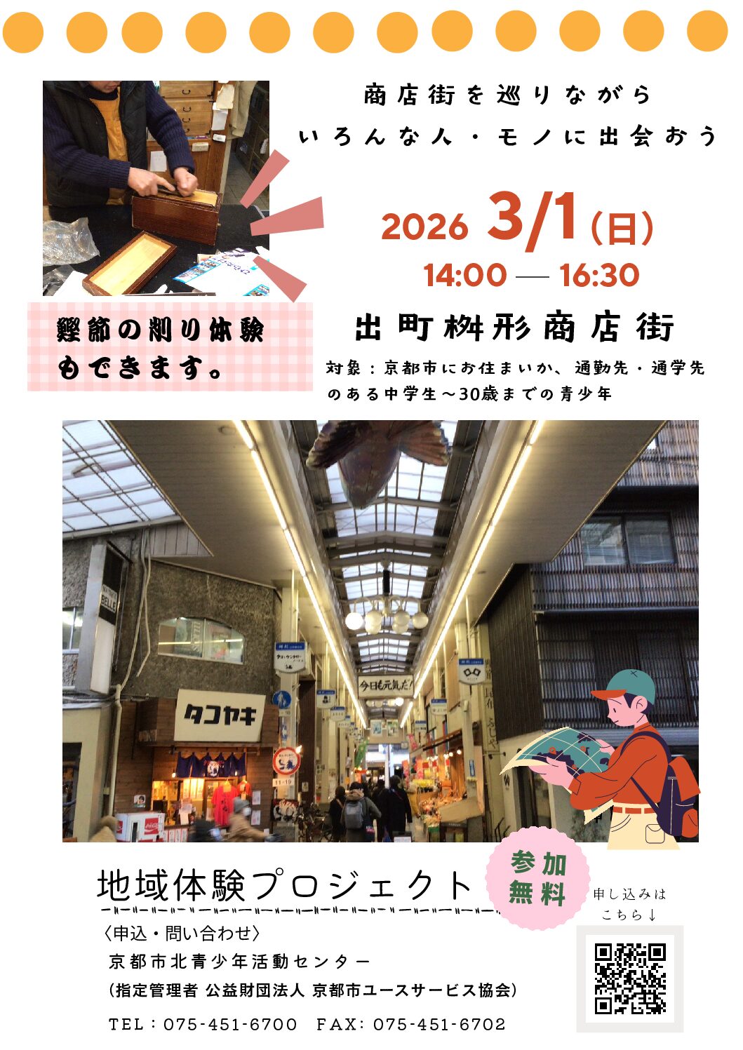 【地域体験プロジェクト】商店街のまちあるき! 出町桝形商店街をみんなで歩いて、気になるお店に入ります。 商店街には個性的なお店がたくさん! 鰹節屋...