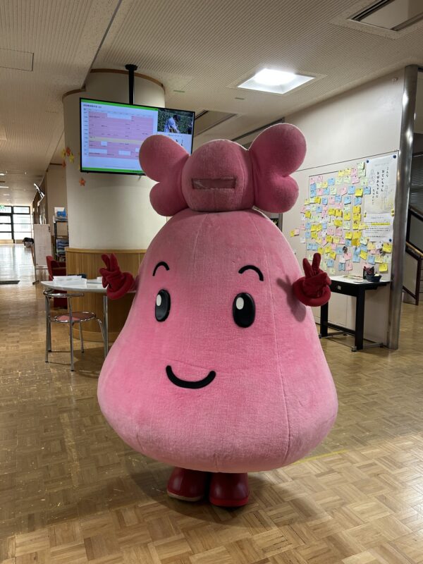 下青にもどると、ピンクの着ぐるみ“こごみちゃん”がみんなをお出迎え!こごみちゃんと一緒に記念撮影をしました。