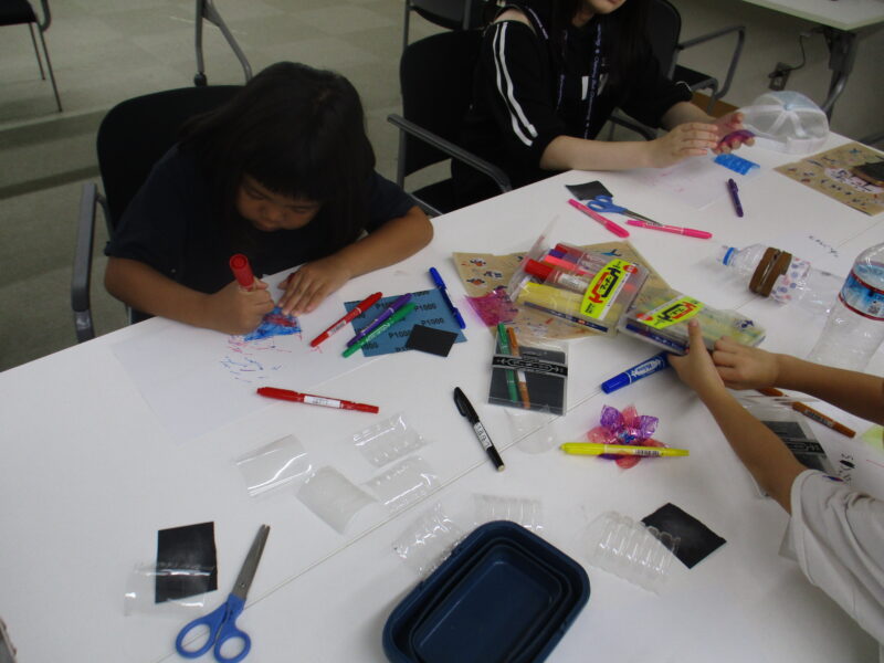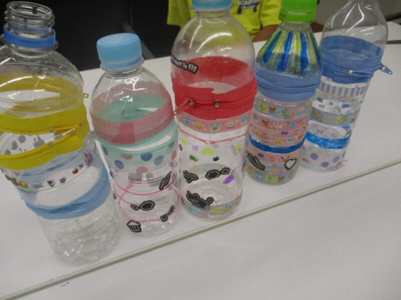後半は、ペットボトルを使って、お花、ペンケースのリユース工作を行いました。