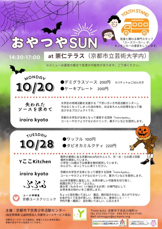 掲載日:2025年10月5日 募集中の事業 10月のおやつやSUN 10/20(月) デミグラスソース 200円 ※バケットorごはん付 ケーキプレート 200円 10/28(火) ワッフル 100円 タピオカミルクティ 220円 2025/08/12 【おやつやSUN】7月報告 2025/07/10 7/14・7/22「おやつやSUN」 2025/06/26 【おやつやSUN】6月報告 2025/06/26 【おやつやSUN】5月報告 2025/06/05 6/10・6/16「おやつやSUN」