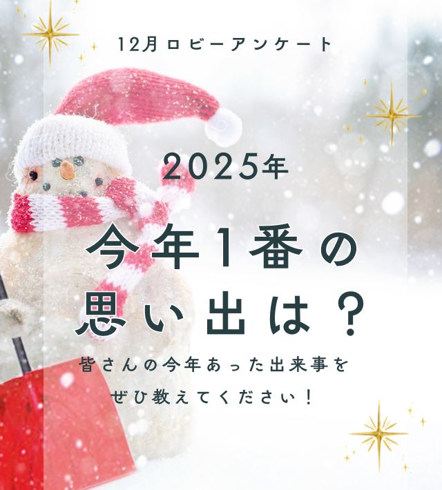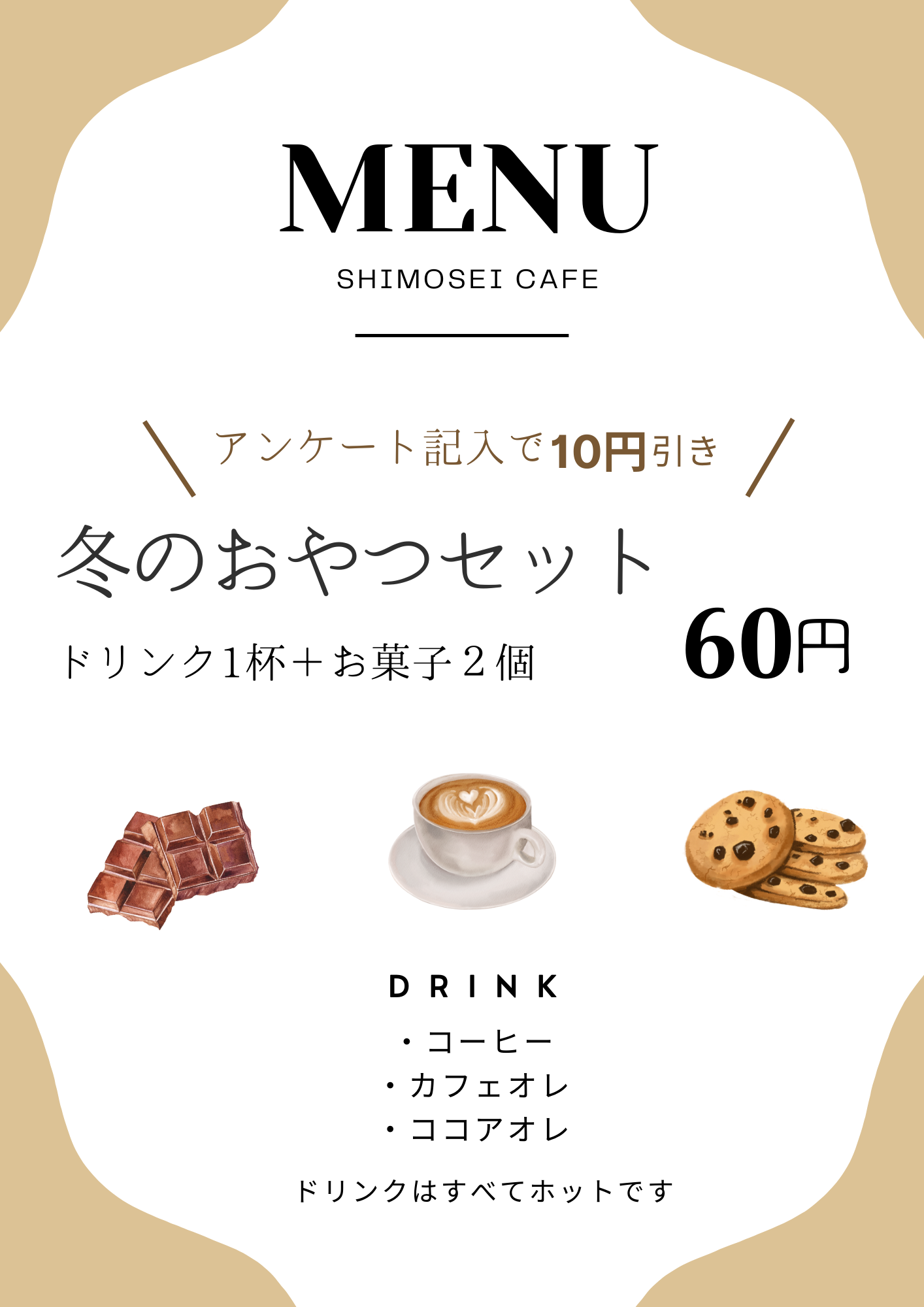 掲載日:2025年12月5日 12月になりました!2025年も残りわずか・・ ということで、今月のアンケートは「今年1番の思い出は?」です! みなさんの今年あった出来事や印象的だったことを教えてください♪ *冬のおやつセット 販売中 温かいドリンク1杯+好きなお菓子2個 60円 アンケート記入で10円引きになります! *しもせい物々交換 まだ使えるけど要らないもの、買ったけど使ってないもの.etc 持ってくる⇔もらって帰る 気軽に参加してくださいね さらにクリスマス企画も計画中です! 12/20~12/25もお楽しみに♪