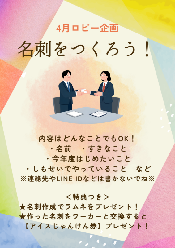 掲載日:2026年4月18日 募集中の事業 4月のロビー企画のお知らせです! 新年度になりましたね。春は出会いの季節ということで、名刺作りしませんか? ワーカーと名刺交換するといいことがあるかも?🌸 *アンケート 「春やなぁと思うこと」 *交流プログラム ○名刺作り