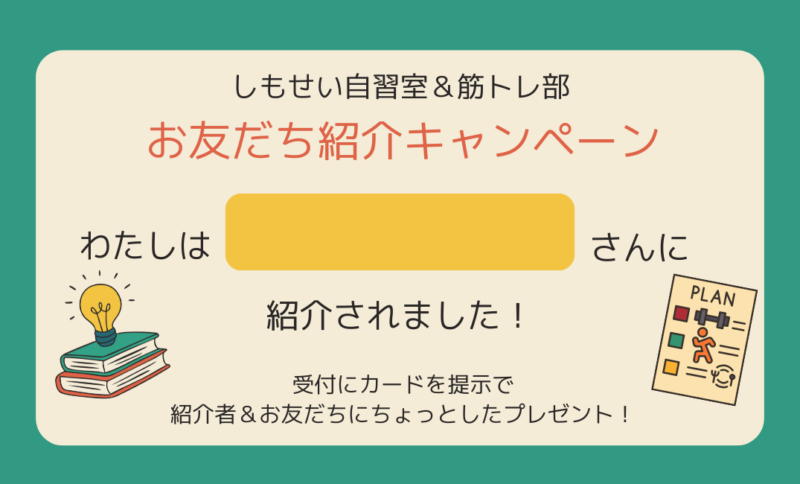 自習室や筋トレ部を利用している方が、まだ来たことのない友達を紹介してくれると、 紹介した方と友達の両方に、ちょっとしたものをプレゼント。