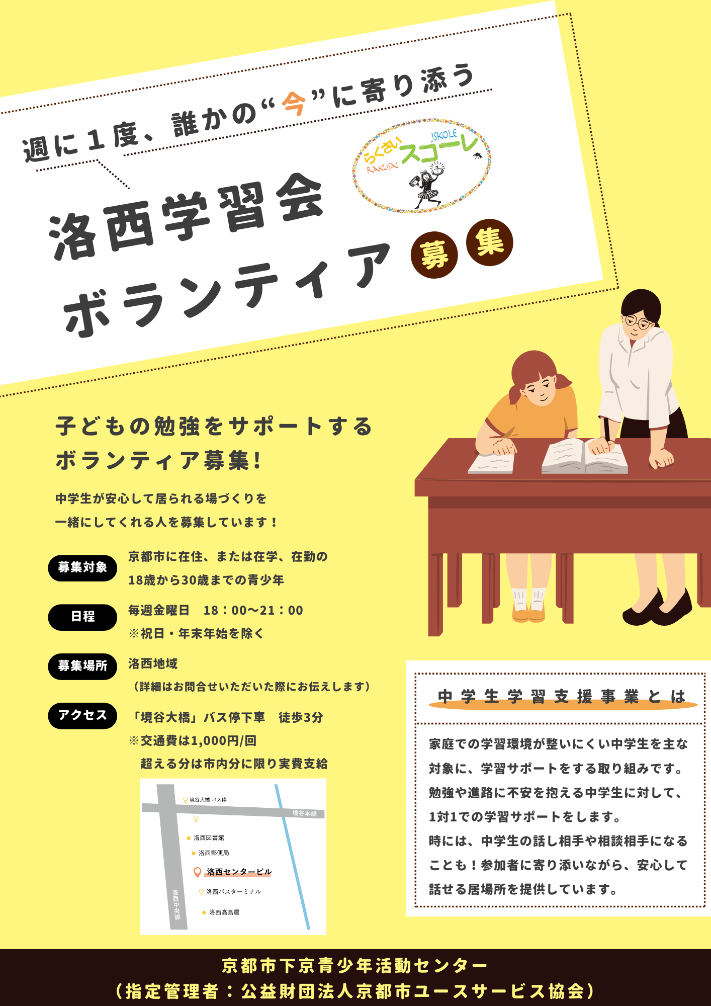 安心して話せる居場所として、「下京学習会」と「洛西スコーレ」の2ヵ所の学習支援事業を運営しています。